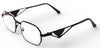 La montatura metallica nera, leggera ma resistente, si distingue per il taglio geometrico delle lenti e per il dettaglio laterale triangolare che dona carattere e modernità.