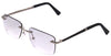Montatura rimless ultraleggera con sfumatura grigia, aste sottili in metallo e terminali neri. Stile elegante, professionale e raffinato.